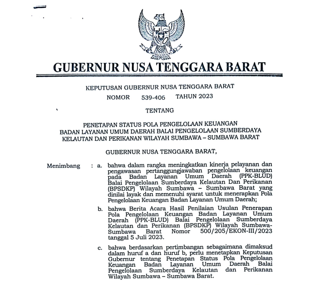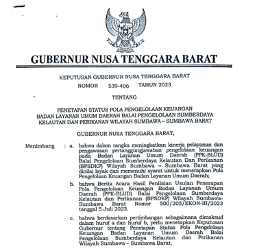 Keputusan Gubernur Nusa Tenggara Barat Nomor 539-406 Tahun 2023 menetapkan status Pola Pengelolaan Keuangan Badan Layanan Umum Daerah (PPK-BLUD) pada Balai Pengelolaan Sumber Daya Kelautan dan Perikanan (BPSDKP) Wilayah Sumbawa–Sumbawa Barat. Penetapan ini bertujuan untuk meningkatkan kinerja pelayanan serta memperkuat pengawasan dan pertanggungjawaban pengelolaan keuangan di lingkungan BPSDKP.